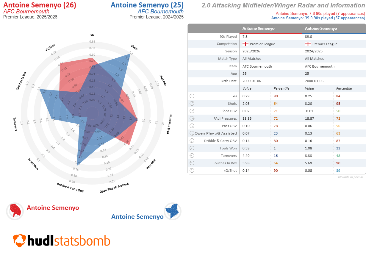 Bournemouth are flying high, sitting 4th in the Premier League, and their left winger has been the best player in the division not named Erling Haaland. It’s been an incredible start to the campaign for Antoine Semenyo, who’s getting a lot of well-deserved hype. I dove into his stats hoping to see some confirmation of what I thought I was seeing in the games, but was surprised to find quite the opposite.