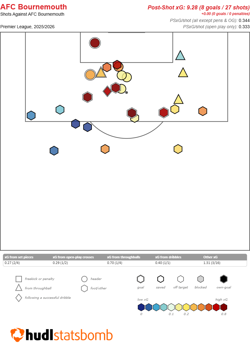 And the problem has not been substandard goalkeeping from new arrival Djordje Petrovic. He hasn’t been spectacular, but he is a plus shot-stopper so far. Bournemouth’s opponents have just been placing their shots expertly, in a way that probably isn’t going to continue. Bournemouth have conceded a full 4 more post-shot xG than regular xG so far this year.