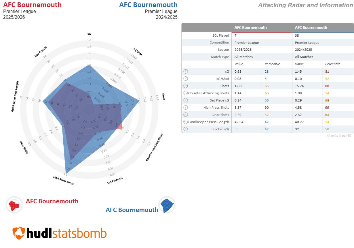 Bournemouth’s attack has been surprisingly butt this season, with just 0.98 xG per 90 so far. They’re trailing well behind last season, when they had an above-average attack.