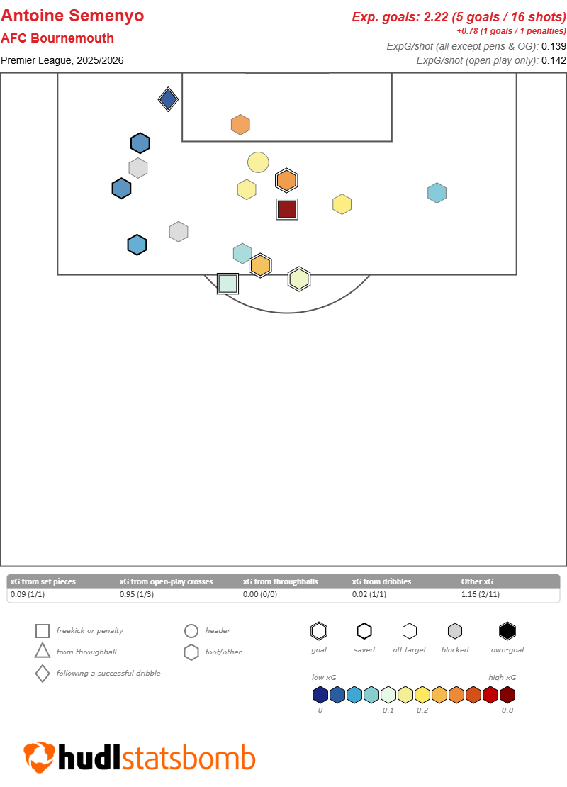 8 total shots on target is a tiny sample, but Semenyo’s goals come from 3.05 total post-shot xG. He’s placing his SOT well — 4 of his 5 goals had over 0.5 post-shot xG — but he’s yet to run into a goalkeeper on top form and/or some bad luck.