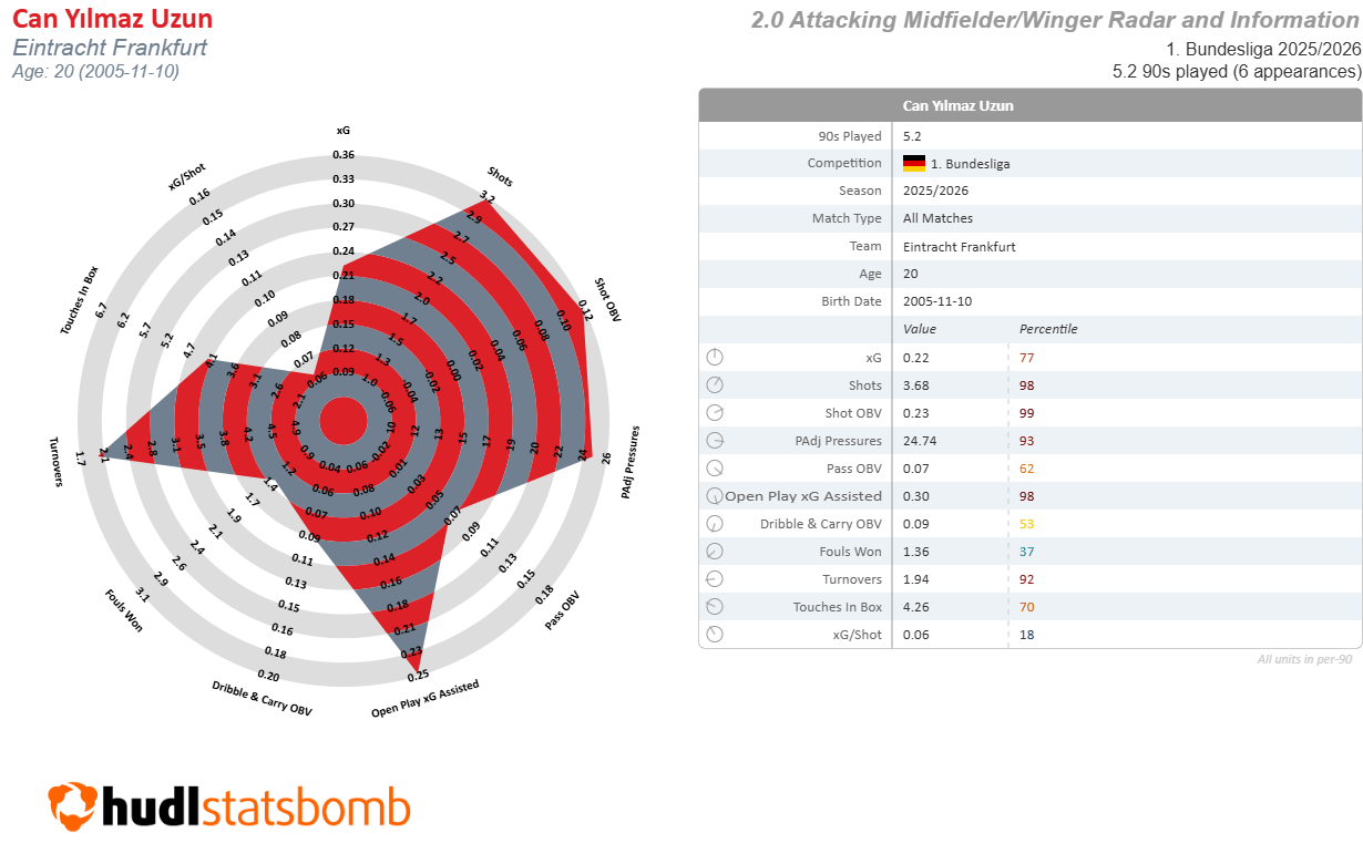 Last season, Uzun only played 761 minutes after arriving from Nürnburg, mostly coming off the bench. But he’s locked into a first choice role now, and he’s quickly become his team’s most important attacking player.
