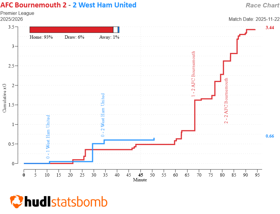 Clearly some game state effects were at play. I think it would be generous to call Bournemouth “unlucky” here, as tempting as it may be looking at those xG numbers. The first goal came from a goalkeeping error, the second had some poor defending, and the Cherries created almost nothing in the first half.