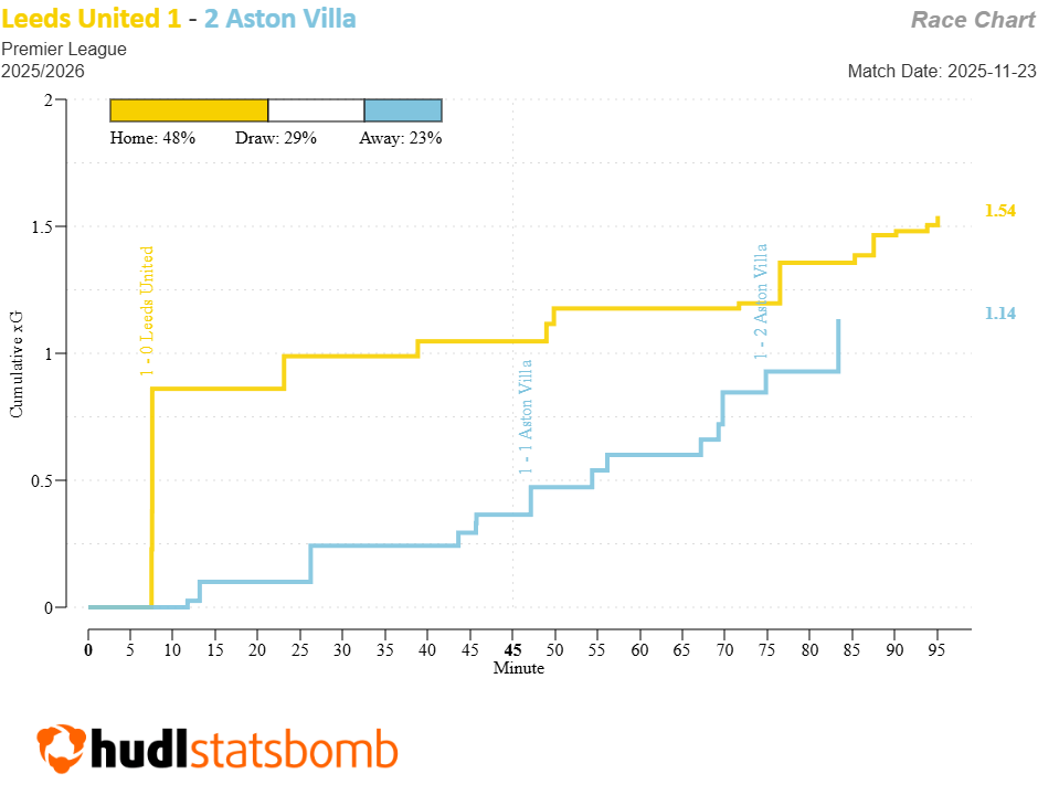 Almost every Leeds game looks like this. They’re in 18th place with a positive xG differential.