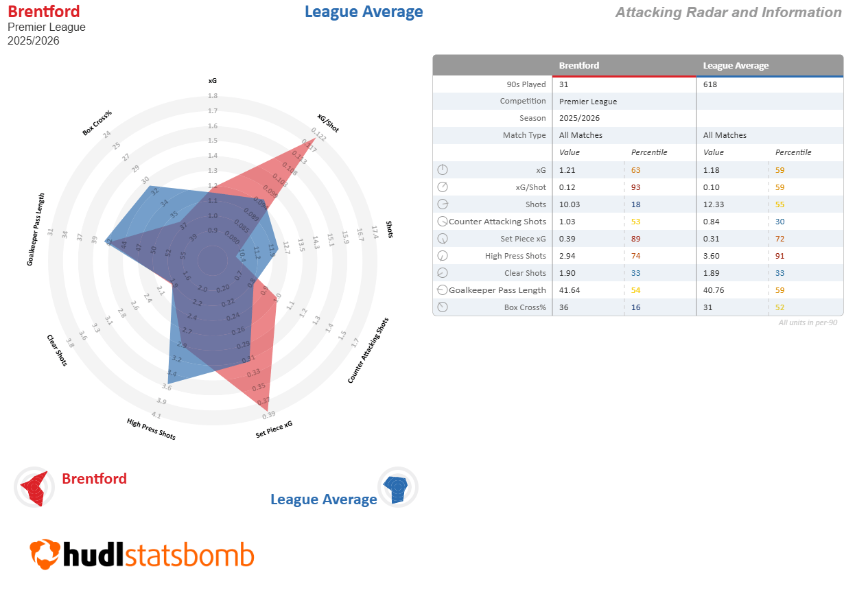 To put it simply, what Brentford have accomplished this season is remarkable. A team that was predicted to struggle mightily this season due to the departing talent is instead shaping up to have their best performance yet in England's top flight. Their play style both caters to the strength of the squad at hand, and is taking advantage of the current tactical meta in English football. There’s also their customary dominance from set-pieces, which has been an annual boost to their overall underlyings. Although they’re only +3 in goal difference during dead-ball situations, Brentford rank third in both expected goals for and against according to Opta Analyst. Meanwhile, Statsbomb has them fourth and second, respectively.