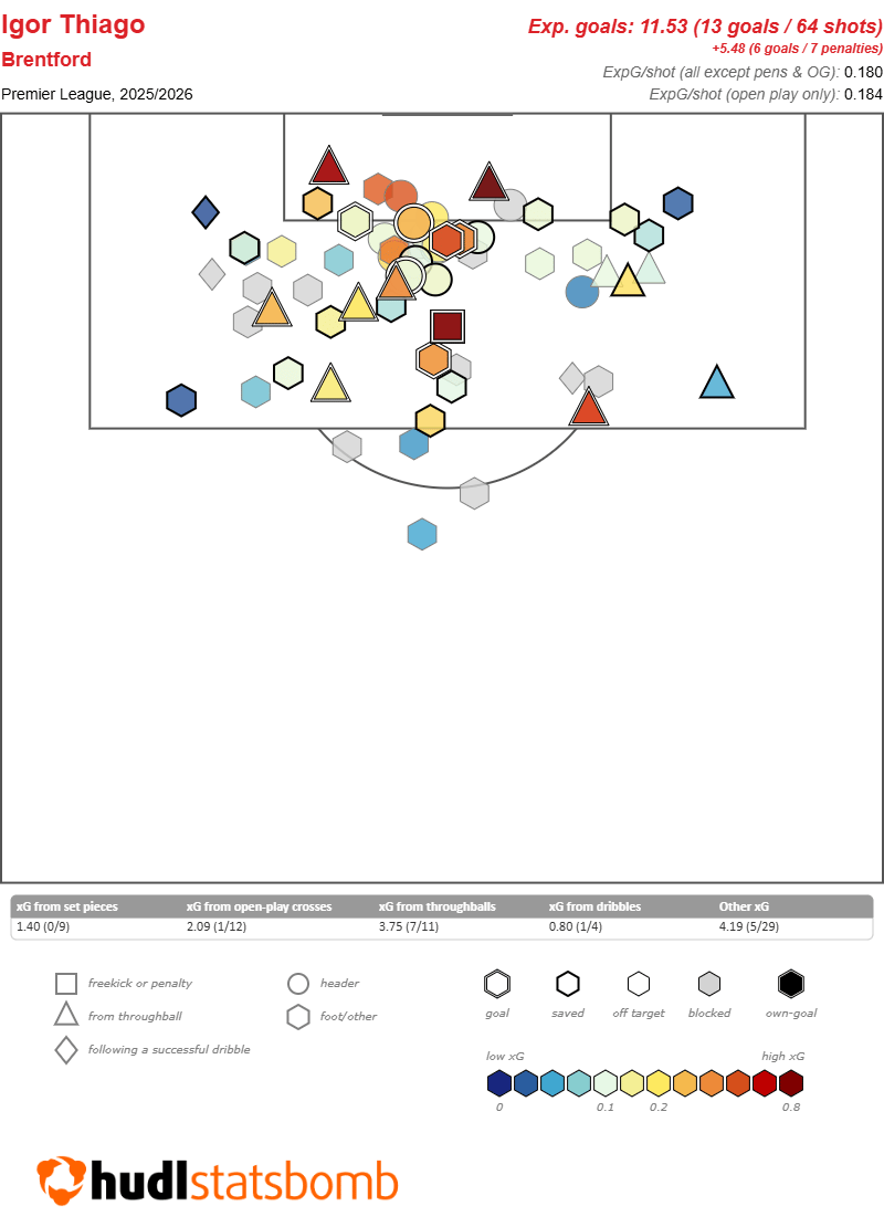 The end result is that Brentford get to live off of a ton of opportunities against a non-set defense. From Opta Analyst, they’re tied for seventh in direct attacks, and lead the league in both fast break opportunities and goals. Although they have the profiles to lean into being a heavy crossing side, it’s not needed given the volume of those fast attacks they generate. Thiago has benefitted quite a bit from the setup himself, using his movement and awareness to find himself in premium shooting positions in the box. An xG/shot of .184 from open play is quite impressive.