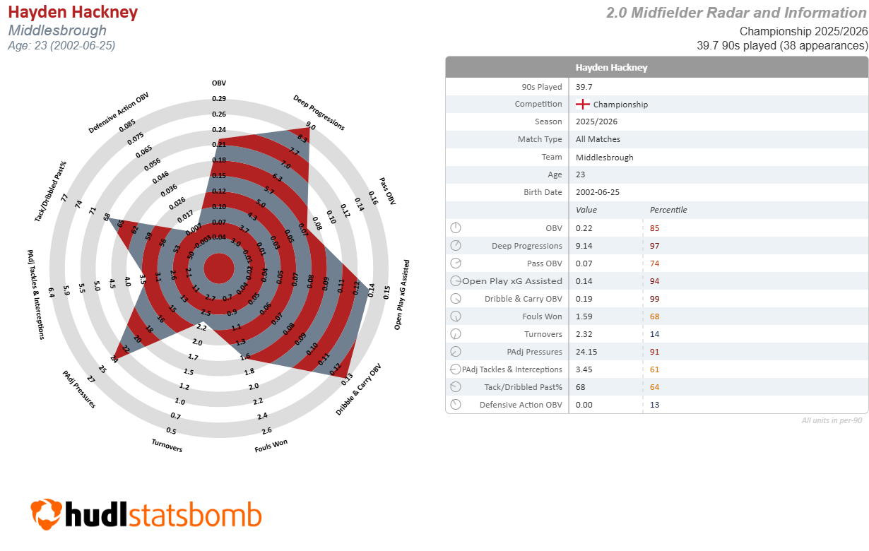 If there’s one player who helps knit this all together, it’s Hayden Hackney. Seasoned viewers of the Championship know him very well, with him emerging on the scene several years ago. He has his fingerprints in so many of Middlesbrough’s threatening passages of play. It can be him playing a simple forward pass into space for a nearby runner during wide combinations, or him escaping pressure with a purposeful carry over a few yards to quicken the tempo and set up a smartly weighted pass in behind. At this point, many would agree he’s proven more than enough to warrant a jump up to a bigger club this upcoming summer.