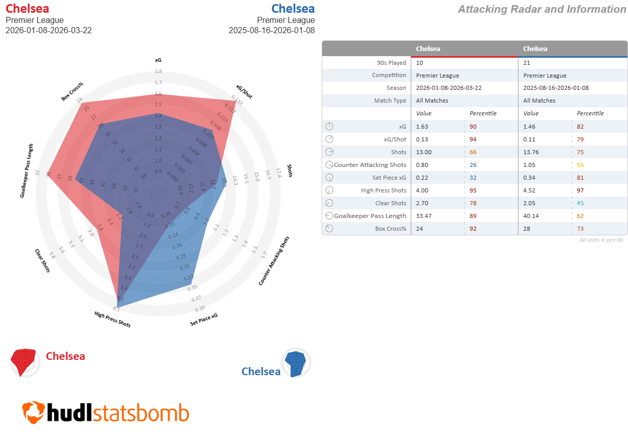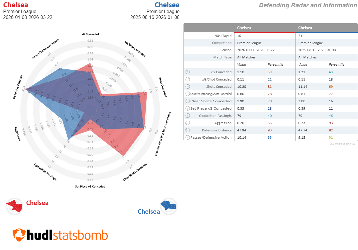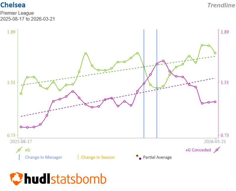 The Blues didn’t exactly look like a well-coached outfit in their 3-0 loss to Everton, but on the whole, Chelsea look marginally improved under Rosenior. He’s actually got xG conceded back to respectable levels after the defense started falling apart in Maresca’s final games.
