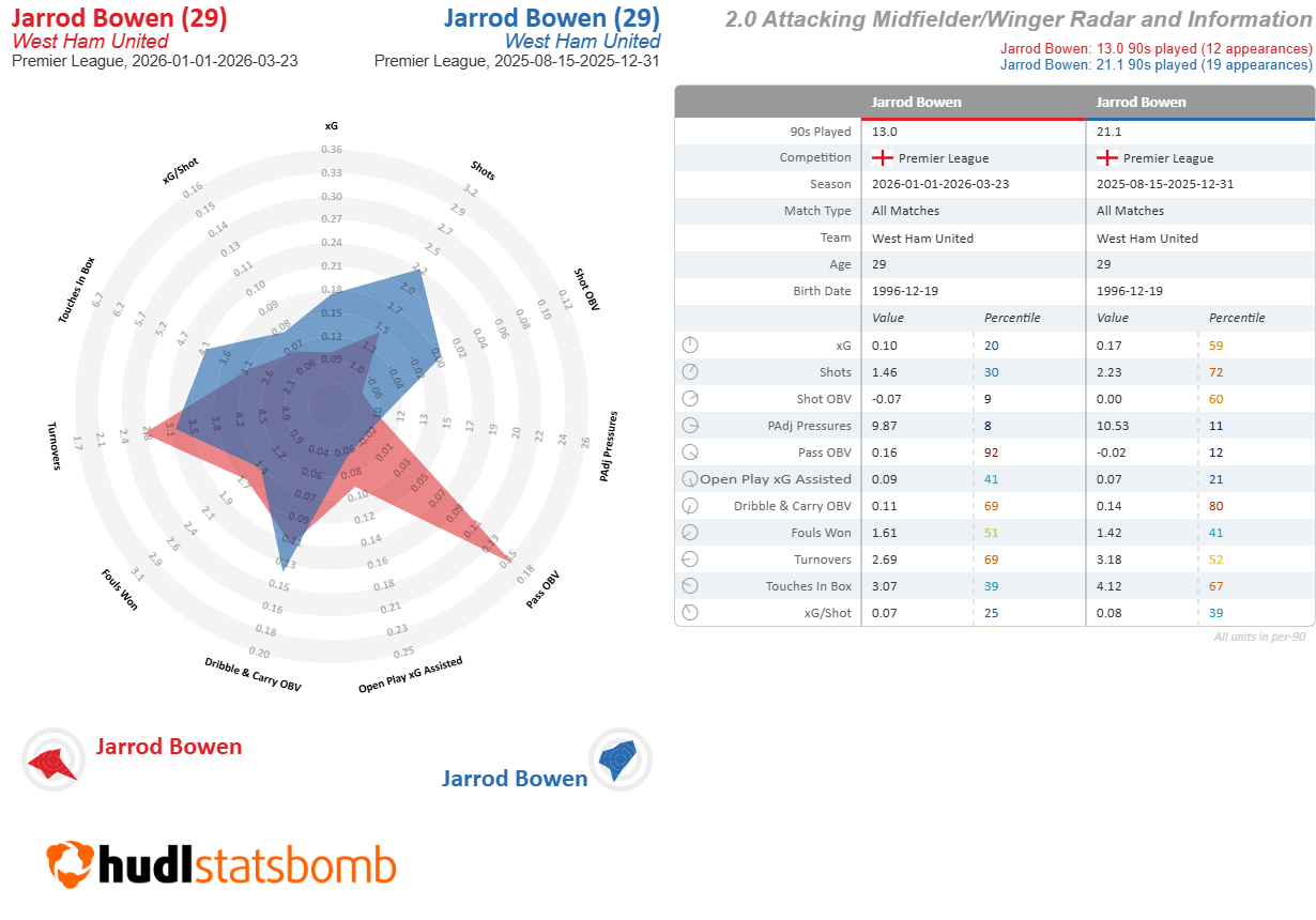 While Bowen has scored some absolute bangers, he does not get many quality shots at all, and he’s actually trending downwards since the new year.