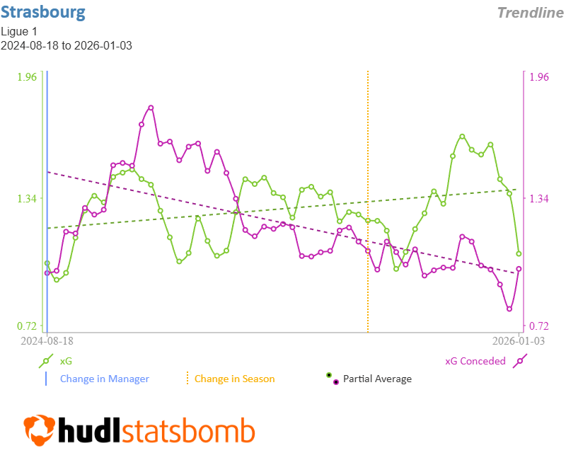 All told, Strasbourg’s attacking output under Rosenior remained fairly consistent, but critically, they made a big improvement defensively.