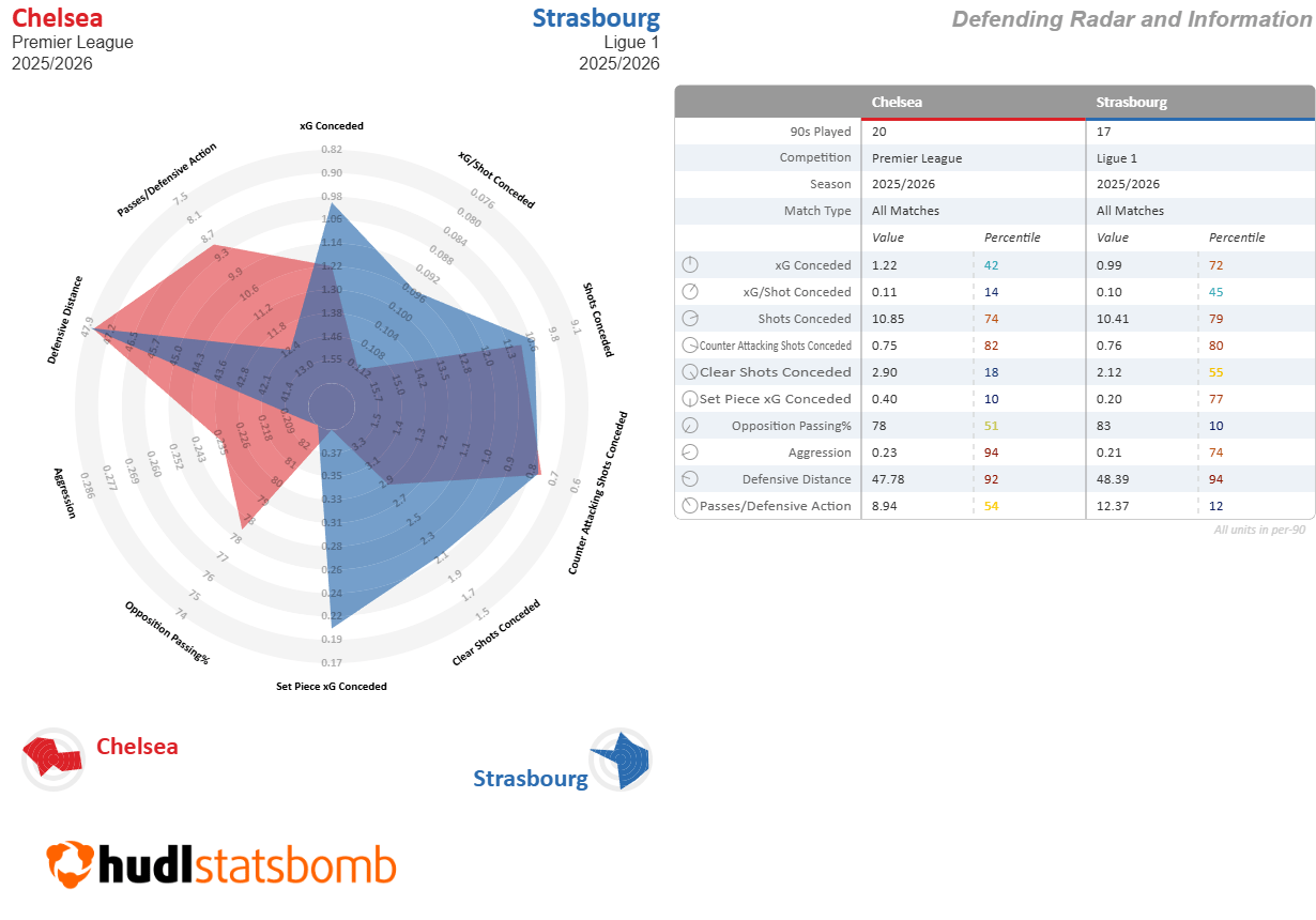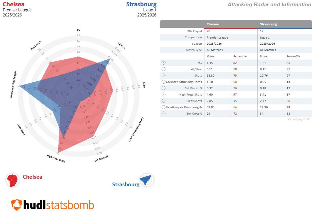 The difference in the xG tallies in the radar might look concerning, but the difference in team and player quality has to be factored in. Furthermore, Strasbourg’s xG/shot average is better as they have been able to consistently create quality chances (especially for standout striker Joaquín Panichelli). How well that translates will likely depend on how quickly Chelsea’s deep build-up improves and how heavily they lean into artificial transitions, though the effectiveness of such an approach may be more limited against the more disciplined deeper defensive blocks in the current Premier League.