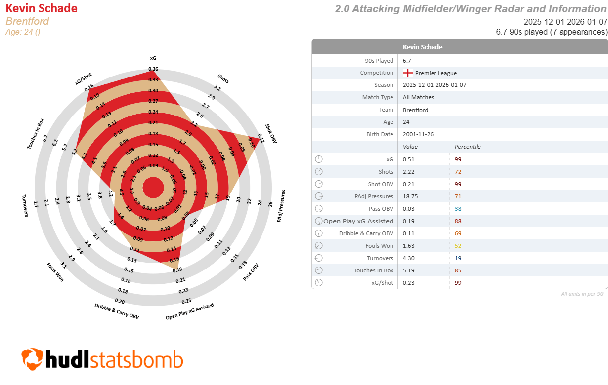 If you’re looking for similarly priced or cheaper alternatives, I’ve got an interesting one that I have not seen from any of the big FPL content creators or analytics platforms. Since December 1, the midfielder (in FPL terms) with the most xG + xA per 90 is Brentford winger Kevin Schade. He’s on a crazy hot streak, but he’s not overperforming his underlying numbers at all.