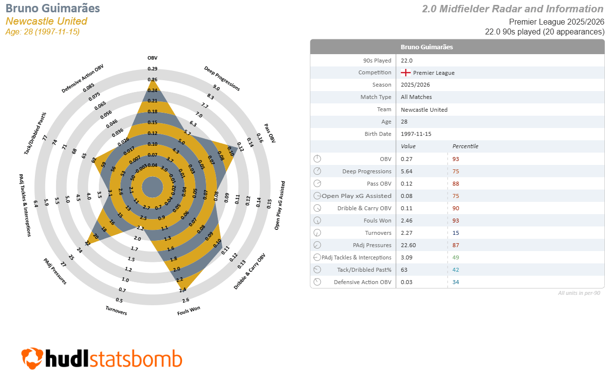 One of the most transferred players in FPL this week has been Bruno Guimaraes, who’s having an excellent season for Newcastle. On first glance, this looks pretty sensible. He’s 3rd in FPL points among midfielders this season, and he’s genuinely been one of the best all-around CMs in the Premier League. I don’t have a negative thing to say about him.