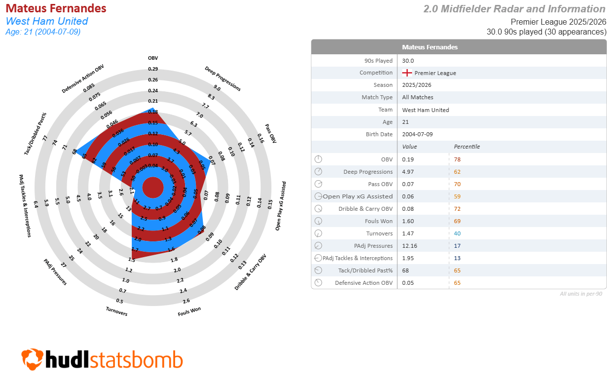 Fernandes has once again shown to be a helpful PL midfielder, which is not a small feat for someone in his early 20s. Compared to 2024-25 when he tried to impact matches in the final third, it’s been more often in earlier phases of play as a West Ham player this season. While he’s perhaps not shown to yet be an amazing distributor on the ball, he still provides some value there. The progressive carrying hasn’t been quite as electric compared to last season, but certainly above average. That kind of dual threat (even at a lower level) allows West Ham to funnel their ball progression towards him at a high amount. His defensive acumen is on less solid footing in comparison, due to issues concerning attentiveness and motor, which hinders potential star outcomes for himself. Although not flawless, what Fernandes has provided has been pivotal to West Ham’s resurgence during the 2nd half of the season.