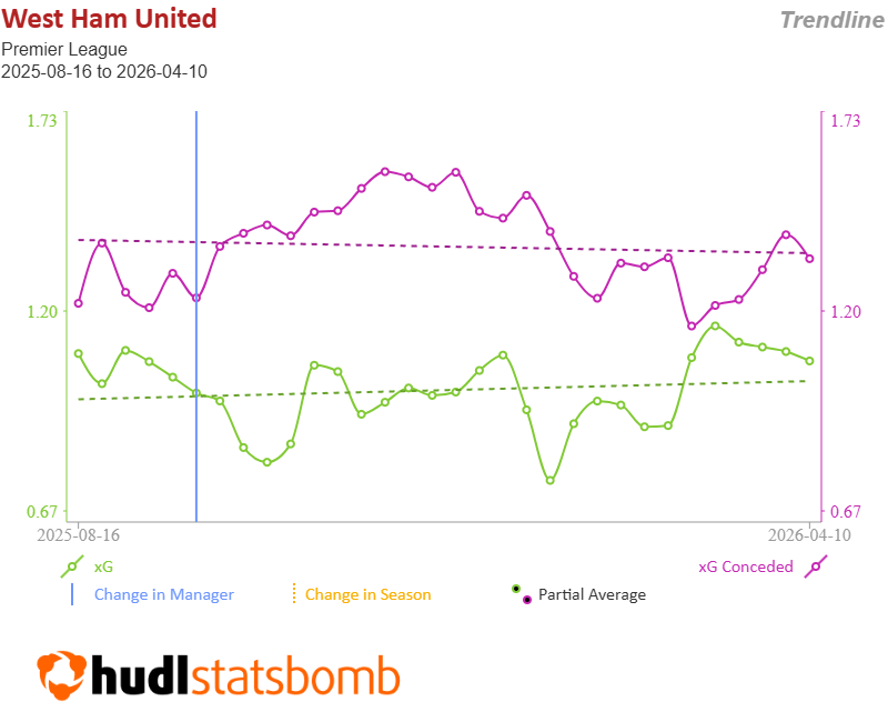 Ever since the calendar flipped to 2026, such angst has at least temporarily dissipated from the fanbase. West Ham have been comfortably mid-table with 18 points in 13 matches, playing at just under a 53 point pace over the course of an entire season. While they don’t have memorable wins over clubs closer to the top of the table, what’s gone differently has been their ability to get results versus those in the lower half. Their five victories have come against Tottenham, Sunderland, Burnley, Fulham, and Wolves. Compared to earlier in the season, they’re a much more spirited side, pivotal for their survival hopes.