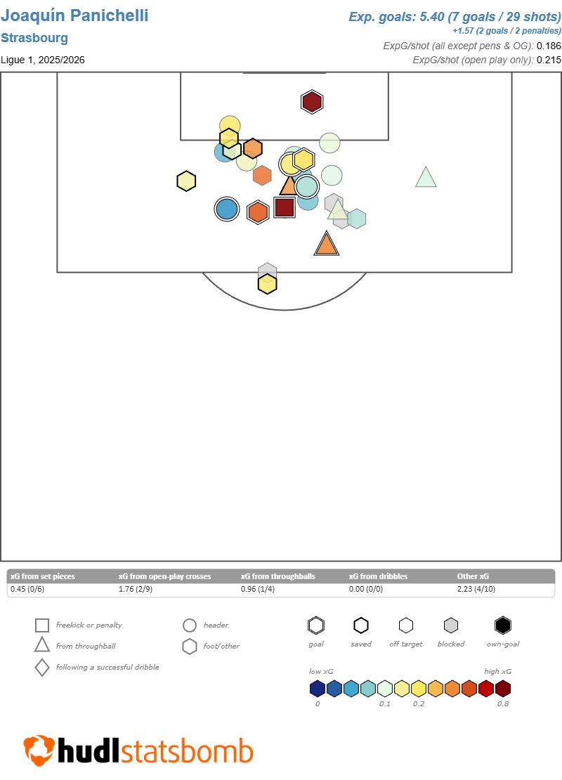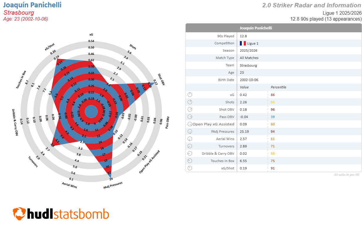 One of those was Joaquín Panichelli. His 21 goals in Spanish football’s second division last season put him on the radar, and that form has continued in France as he’s 2nd in the league for goals and tied for first in non-penalty goals. He’s ably filled the role as Strasbourg’s new #9 after taking over from Emegha, acting as a focal point to play off of.