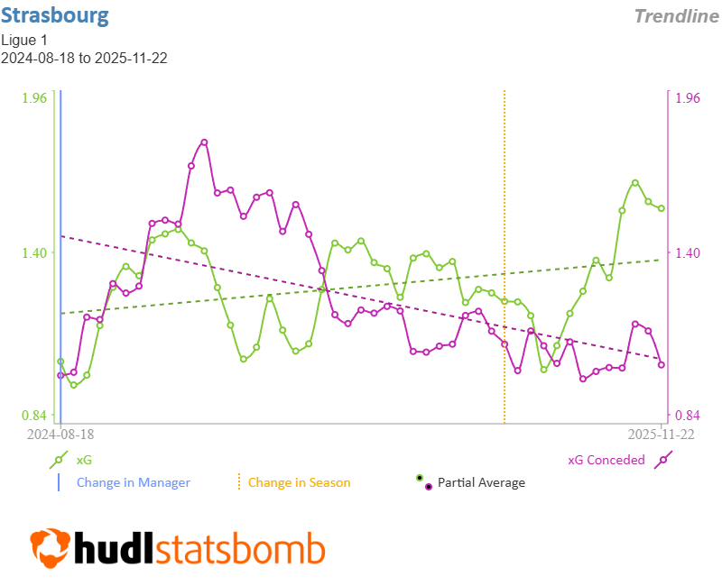 The 4-1 defeat to Rennes earlier this month was their biggest loss so far this season. Strasbourg’s buildup was handled time and time again, including in a few instances where they conceded high turnovers which nearly turned into high grade chances. They couldn’t handle the physicality Rennes brought in the encounter, which played a major part in their 3rd goal which essentially ended the match early in the 2nd half. Panichelli’s timing with his movement was off, and it was overall a rough day in the office.