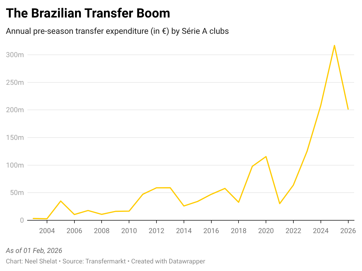 Flamengo’s financial capacity was boosted by their exceptional 2025 campaign, which ended with four titles as well as participations in two FIFA tournaments, but four other sides have already crossed the €15m figure on transfer fees. Brazilian clubs’ dominance in CONMEBOL competitions (they’ve won each of the last seven Copa Libertadores titles), big sales, the league’s increasing broadcasting revenue, and other revenue sources (including sponsorships and foreign ownership) are all factors behind this trend, which will certainly continue to impact the European market.