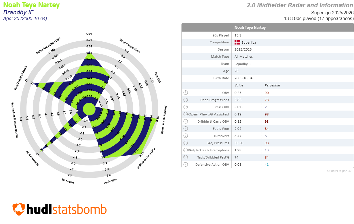 If you’re looking for guys you can watch immediately, allow me to recommend Noah Nartey. The Danish youngster became a key figure for Brøndby over the last couple of years and developed quite well (benefitting from the coaching of Steve Cooper, among others), ultimately earning a €8m move to the reinvigorating Lyon.