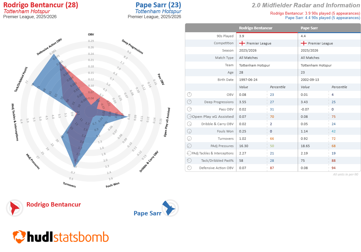 With Dejan Kulusevski and James Maddison out injured, likely future starting No. 8 Lucas Bergvall — who shows flashes of brilliance, even if he’s a bit frustrating on the whole — has been moved into a more attacking midfield role. The No. 8 minutes have mostly gone to the rotation of Bentancur and Pape Sarr, who is the exact same guy except younger and a bit more athletic.