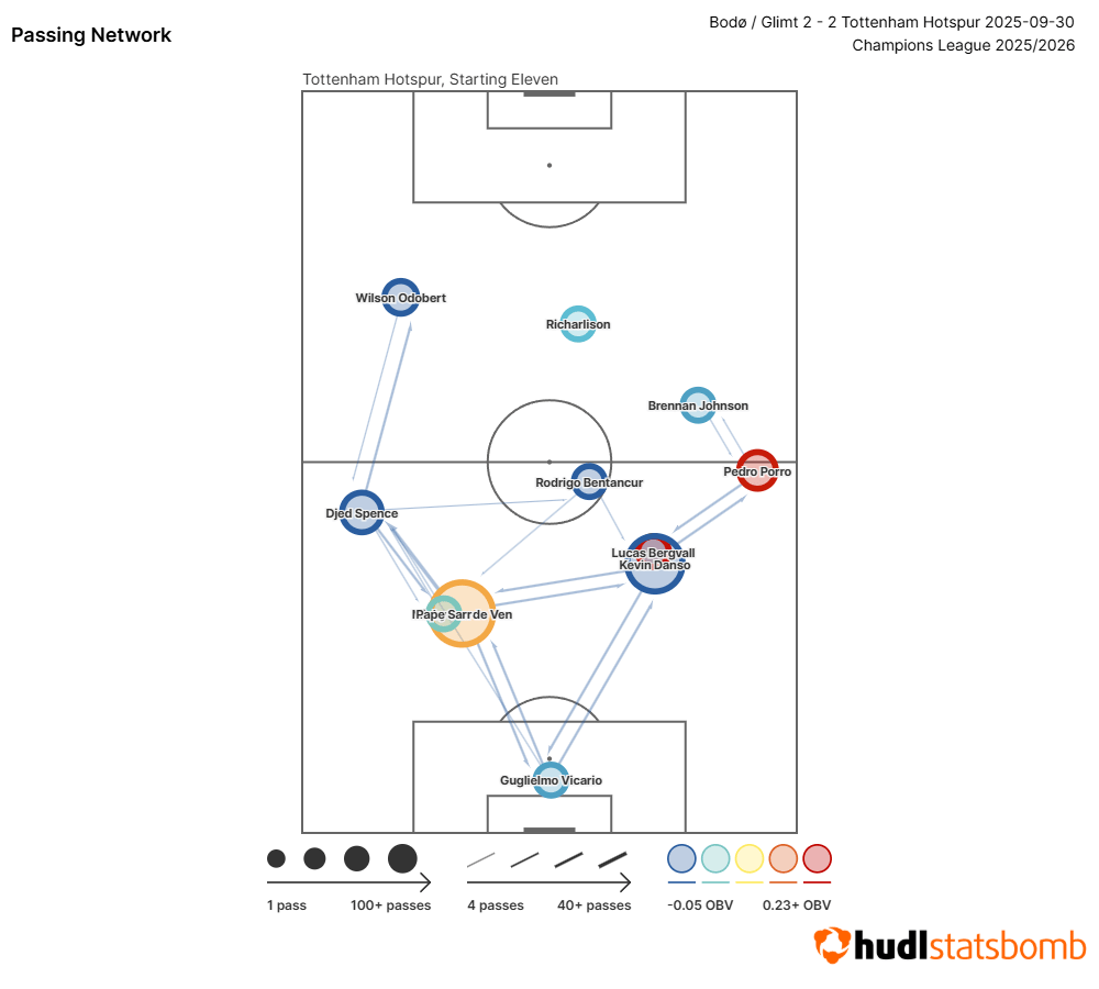 The results are apparent in this absolute war crime of a passing map from Spurs’ 2-2 draw with Bodo/Glimt midweek, which prompted me to make an admittedly grim and not very funny joke. Can you blame me, though? Look at this shit.