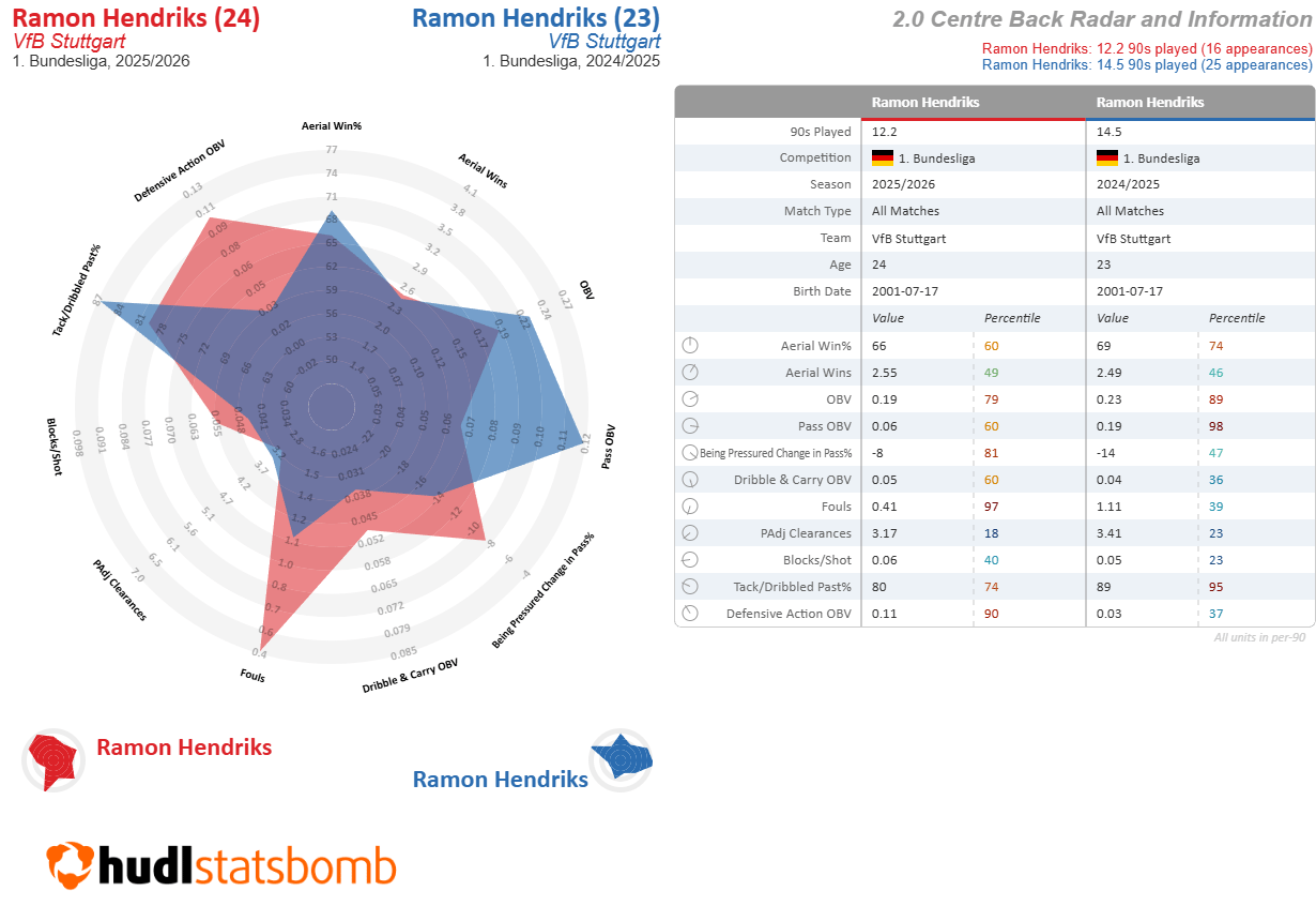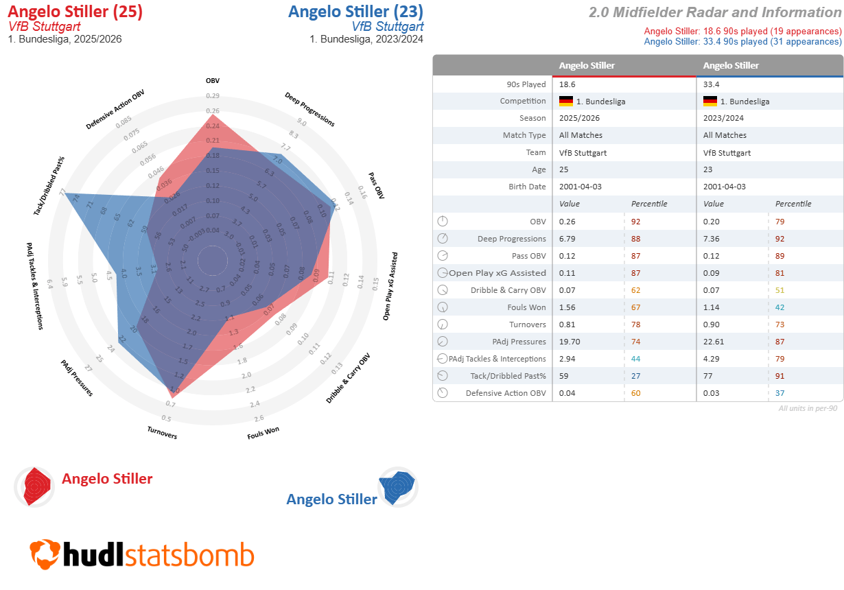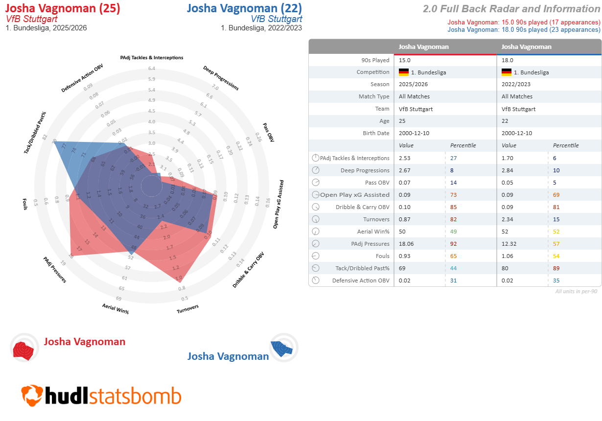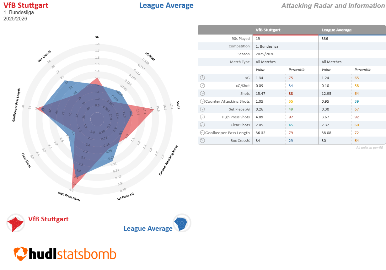 On the bright side, these challenges pushed this Stuttgart side to improve in both respects by the time 2025/26 came around. While they have stuck to their 4-4-2 setup and continue to want to keep more of the ball, they now have more options and ideas against different types of opponents, especially as pressing intensity has continued to drop across the league.