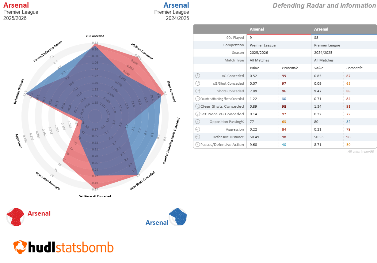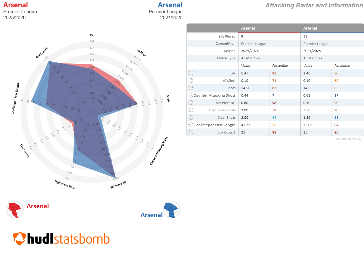 Arsenal Compared to Corresponding Fixtures Last Season Points: +9 (22 vs 13) xG: -1.2 (14.9 vs 16.1) G: -2 (16 vs 18) xGA: -3.6 (5.2 vs 8.8) GA: -8.0 (3 vs 11) xG Dif: +2.4 (9.7 vs 7.3) G Dif: +6 (13 vs 7)